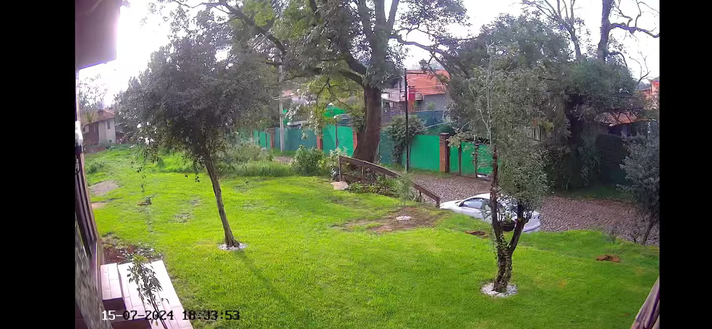 - Cámaras de seguridad exteriores en la propiedad (la cámara se encuentra en el exterior monitoreando el perímetro y el ingreso.)